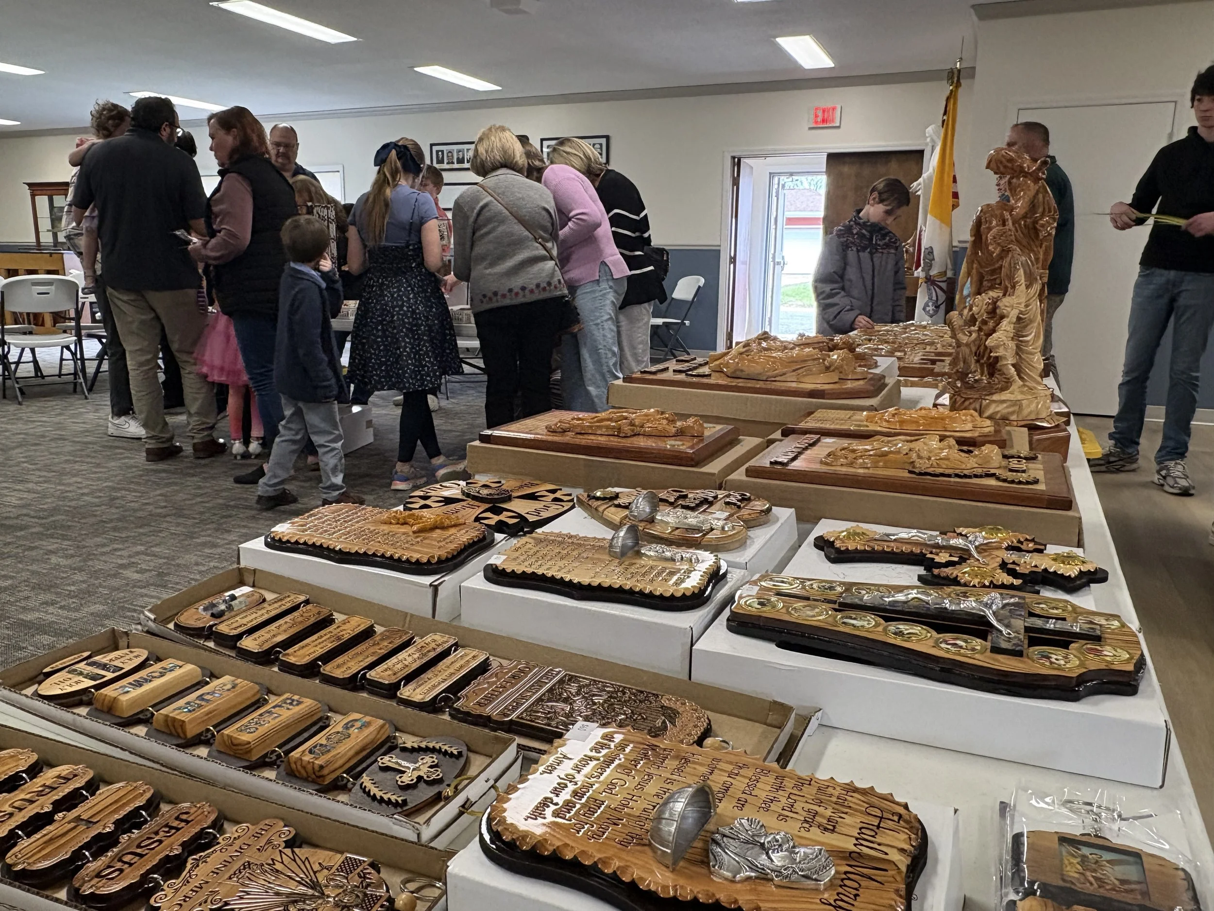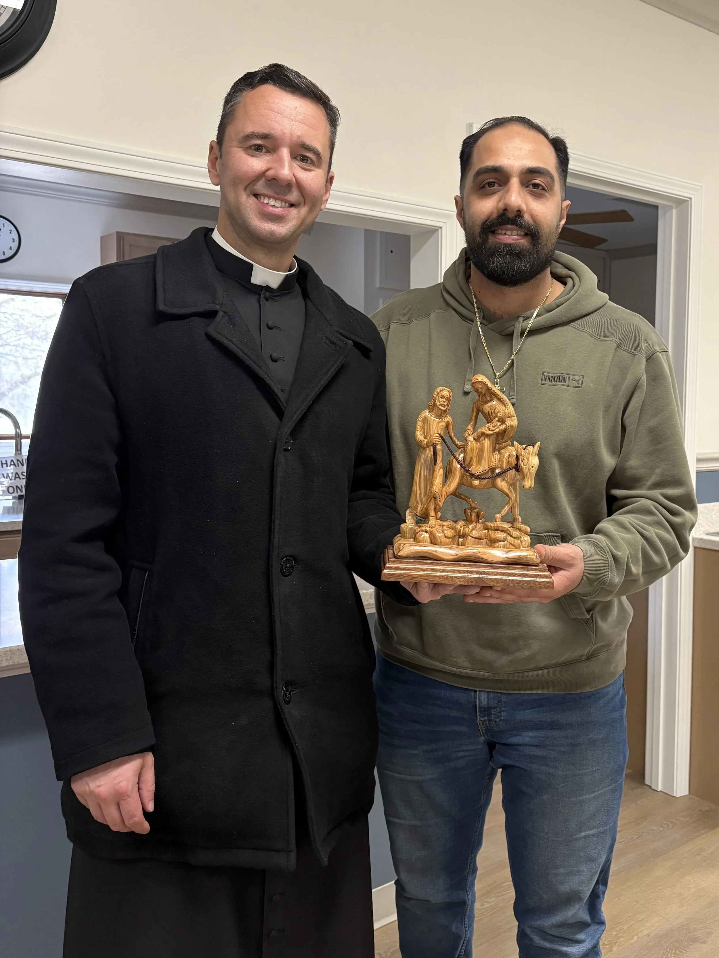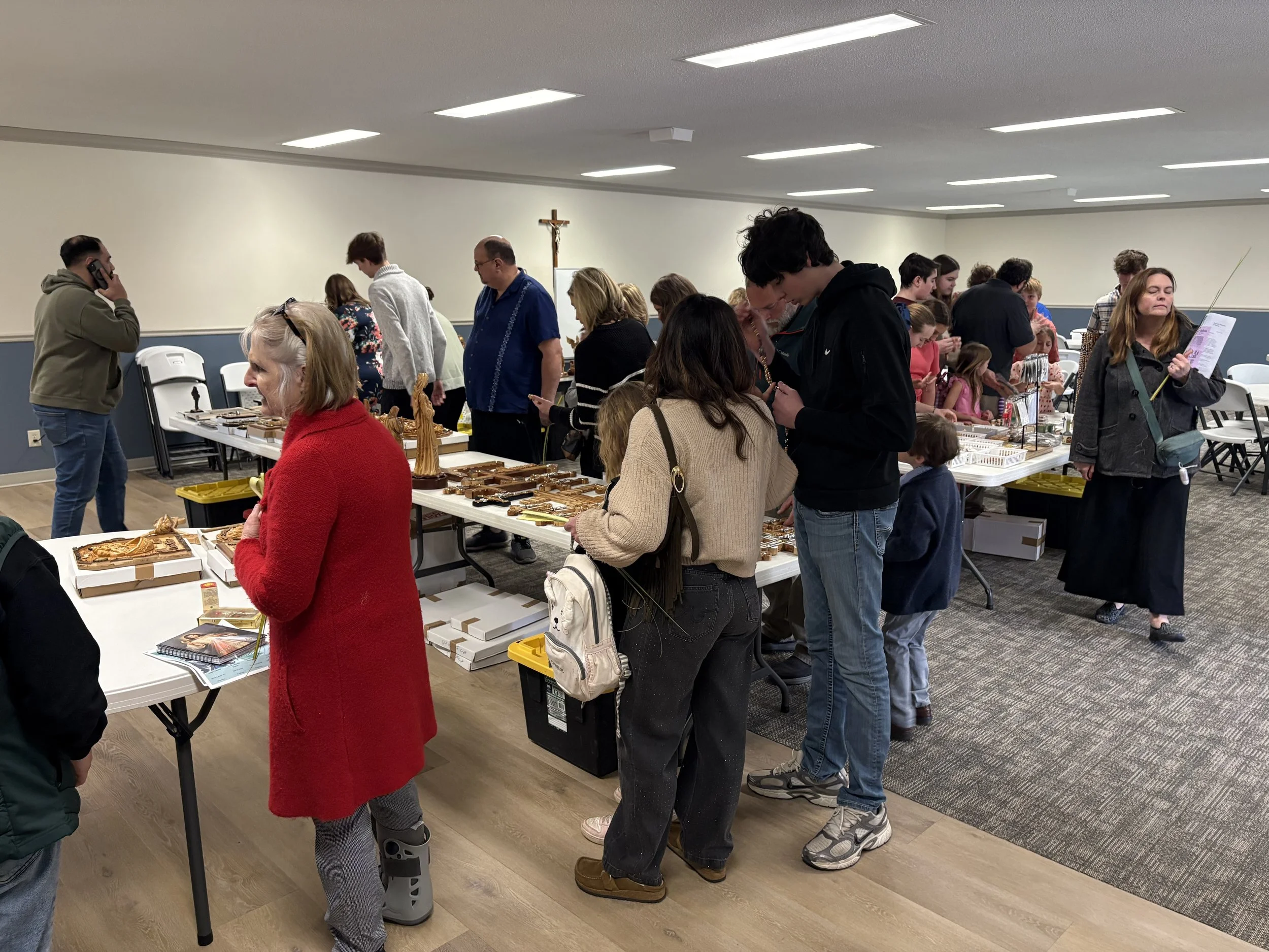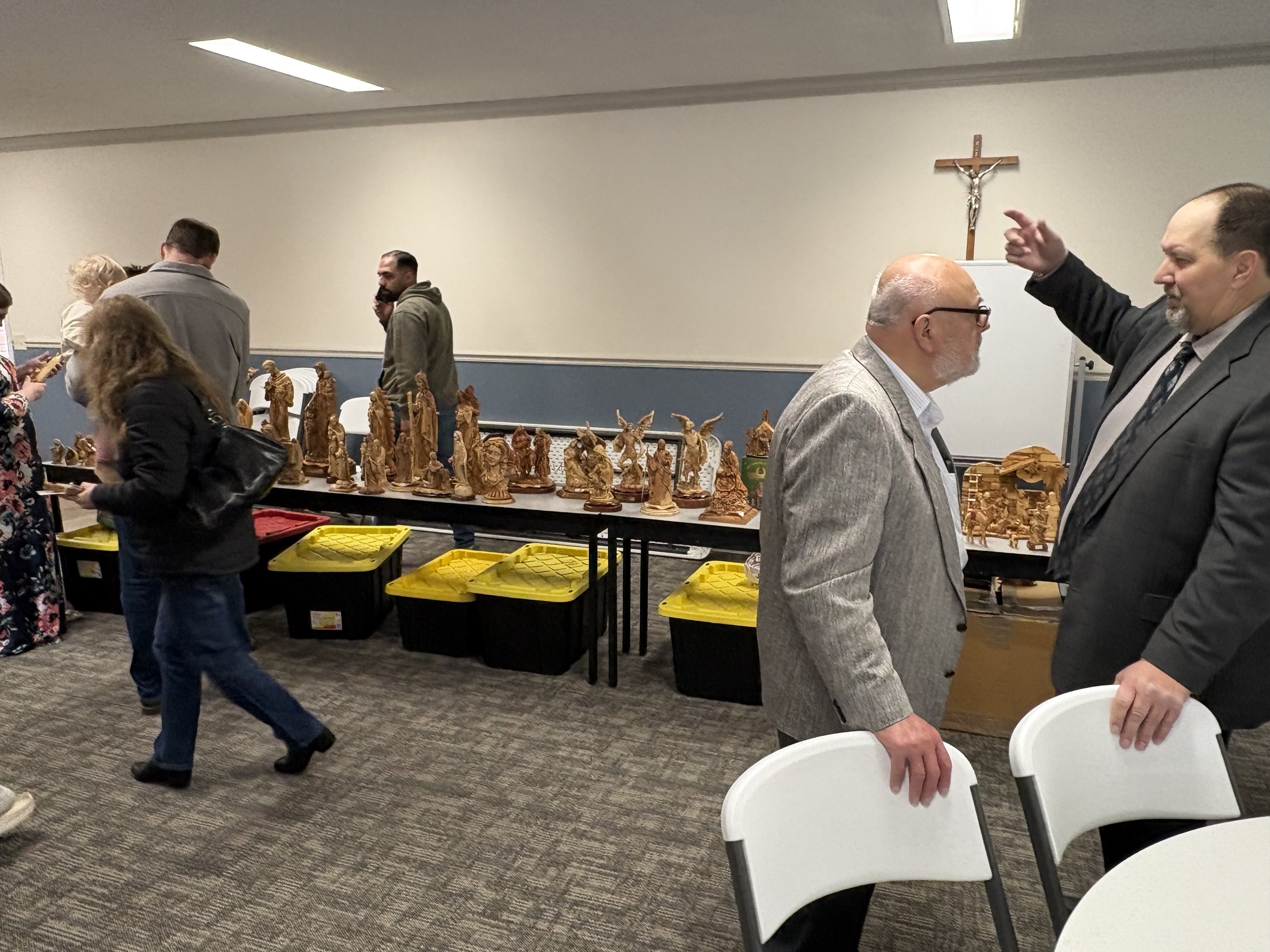 Palm Sunday weekend, Incarnation Parish welcomed Holy Family Carvings to sell their carefully handcrafted statues and crucifixes after each Mass. Woodcarving is one of the main industries that supports the small remnant of Christians who remain in Bethlehem, the birthplace of the infant Jesus. It is particularly difficult now during this time of war when it is unsafe to travel to the Holy Land - and these Christian families depend on tourists coming to buy their beautiful olive wood creations. So, the families bring their goods to the customers. Adam grew up in Bethlehem, and he brought these items to us, and also generously gifted a beautiful statute of the Flight into Egypt carved from solid wood to the parish.